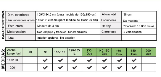 | MEDIDAS | 160X180 Duo, 160X190 Duo, 160X200 Duo, 180X180 Duo, 180X190 Duo, 180X200 Duo, 200×180 Duo, 200×190 Duo, 200×200 Duo, 90×180, 90×190, 90×200, 105×180, 105×190, 105×200, 120×180, 120×190, 120×200, 135×180, 135×190, 135×200, 135X180 Duo, 135X190 Duo, 135X200 Duo, 150X180 Duo, 150X190 Duo, 150X200 Duo |